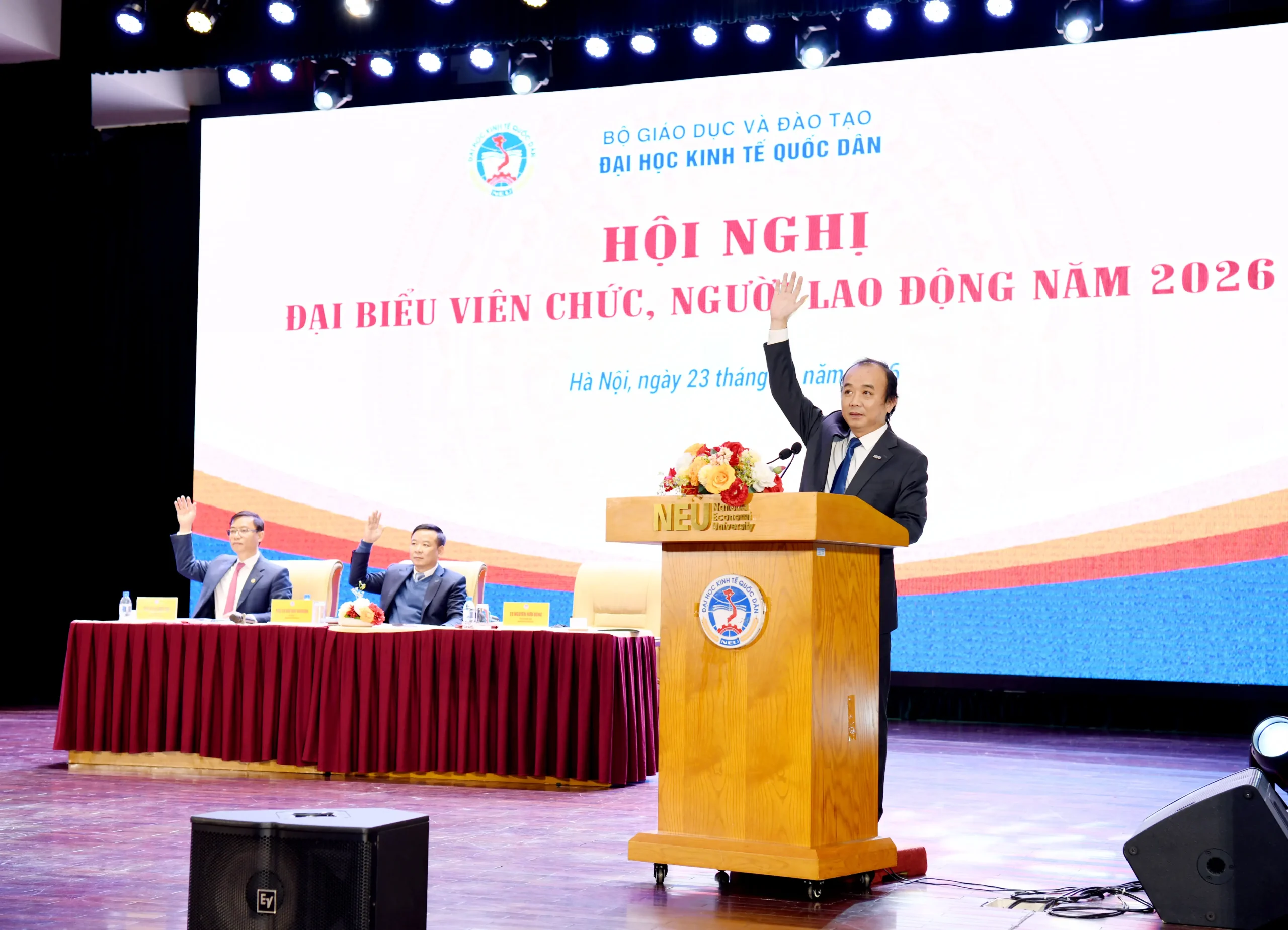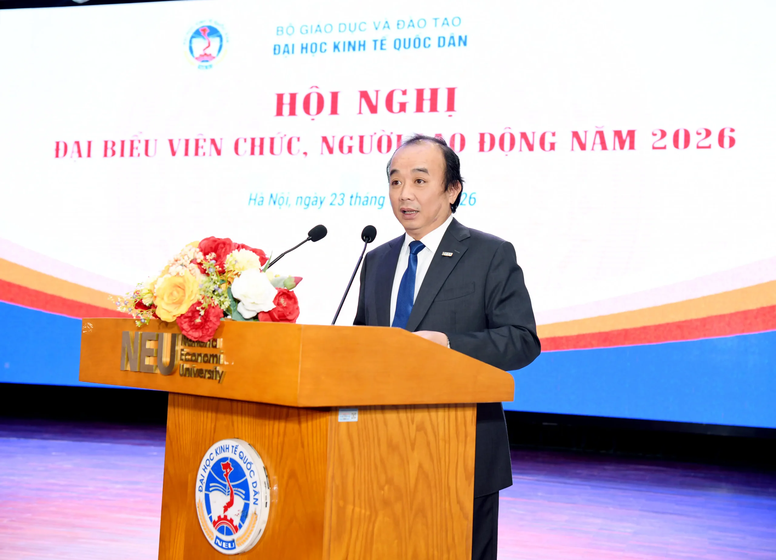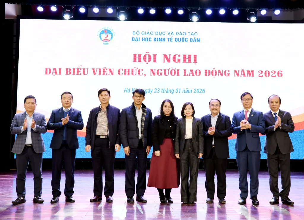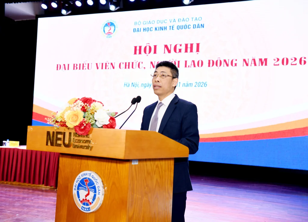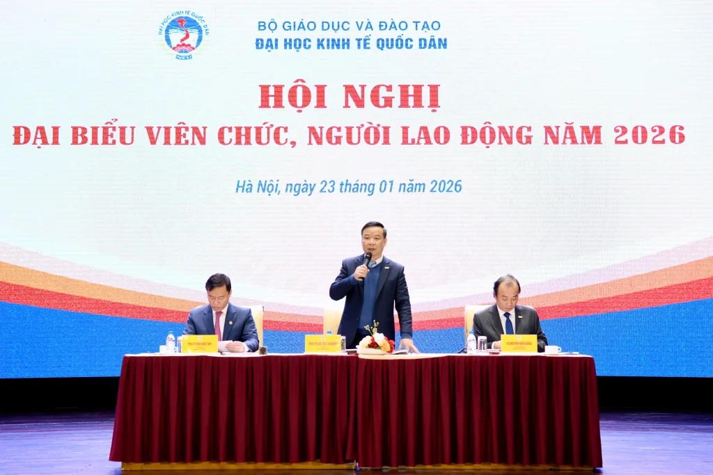 Trong không khí phấn khởi của những ngày đầu năm 2026 và hướng tới việc triển khai các nhiệm vụ trọng tâm trong giai đoạn mới, sáng ngày 23/01/2026, Đại học Kinh tế Quốc dân đã tổ chức Hội nghị Đại biểu viên chức, người lao động năm 2026. Hội nghị là dịp quan trọng để Đại học nhìn lại kết quả thực hiện nhiệm vụ trong năm qua, đồng thời thảo luận, đánh giá những khó khăn, thách thức và đề ra phương hướng, nhiệm vụ cho thời gian tới, trên tinh thần đoàn kết, dân chủ và trách nhiệm.