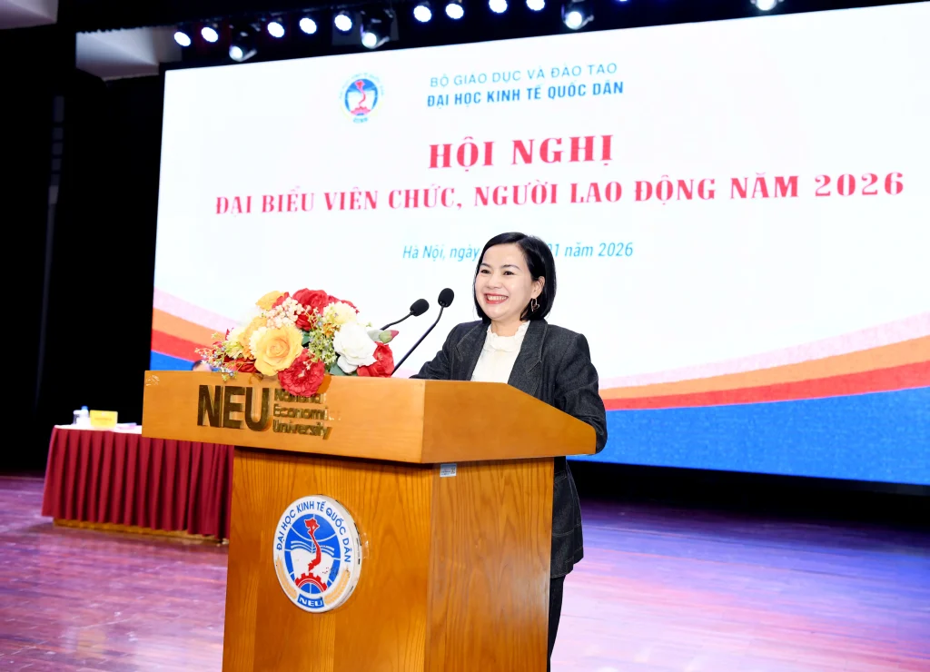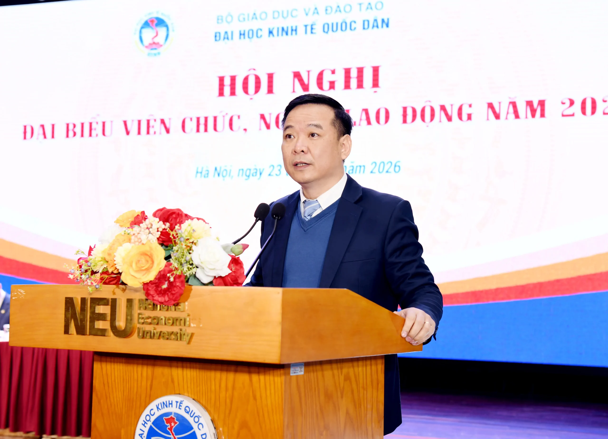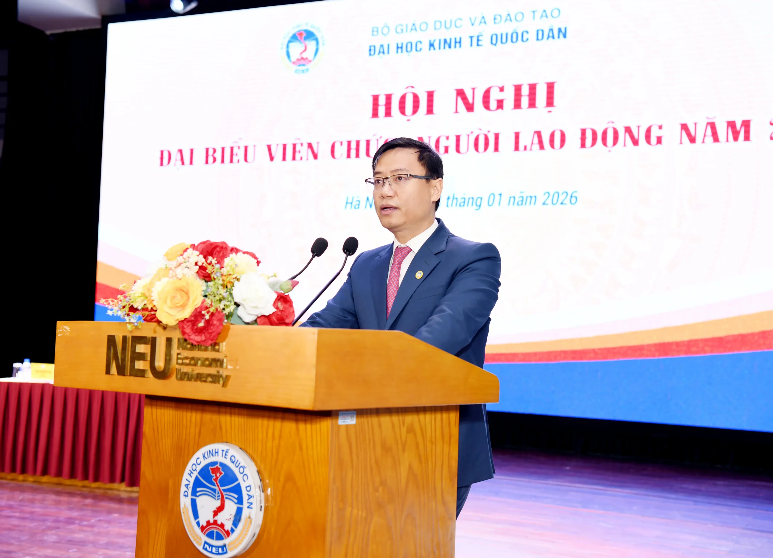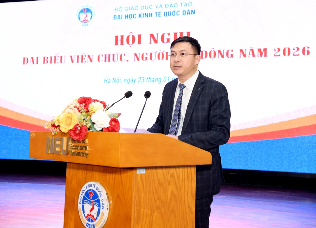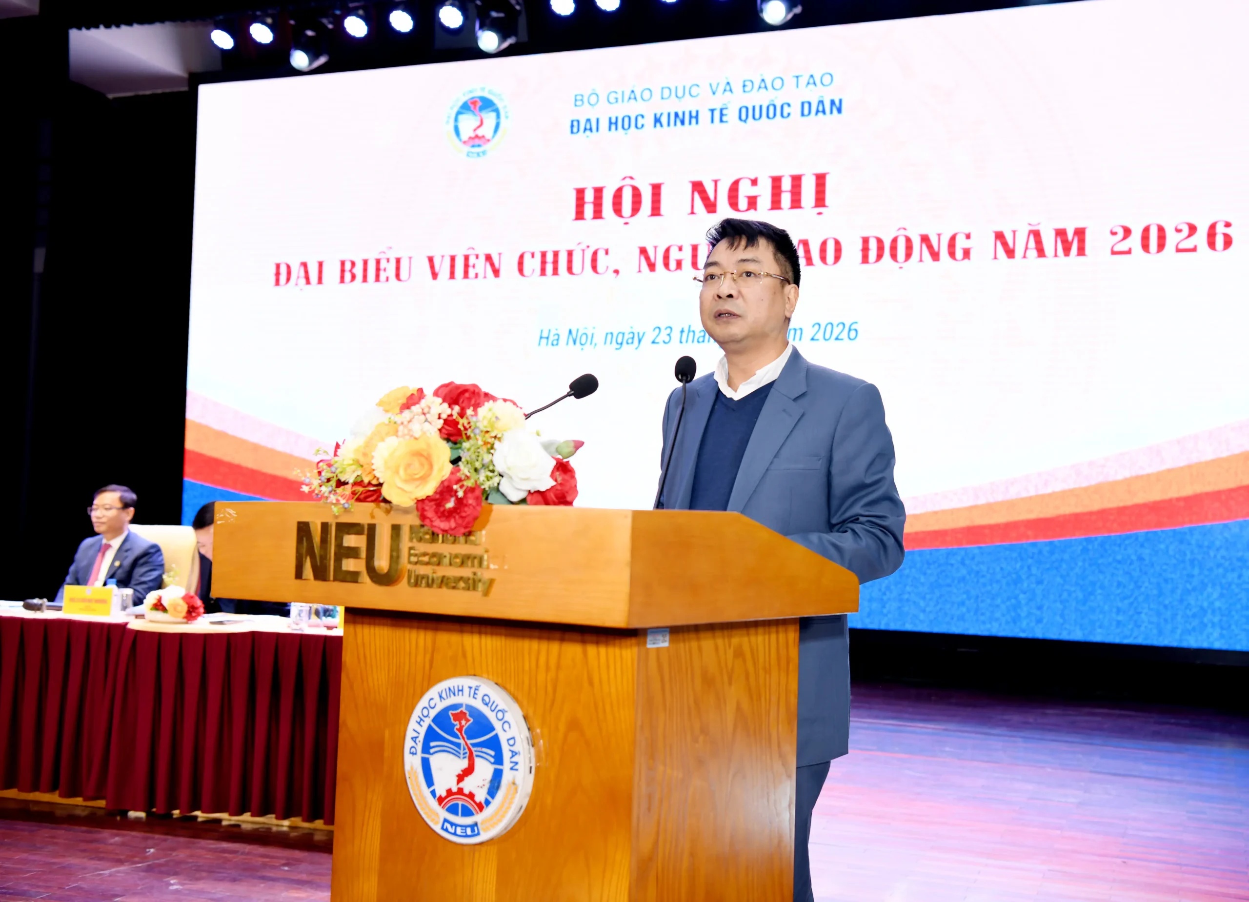 Trong không khí phấn khởi của những ngày đầu năm 2026 và hướng tới việc triển khai các nhiệm vụ trọng tâm trong giai đoạn mới, sáng ngày 23/01/2026, Đại học Kinh tế Quốc dân đã tổ chức Hội nghị Đại biểu viên chức, người lao động năm 2026. Hội nghị là dịp quan trọng để Đại học nhìn lại kết quả thực hiện nhiệm vụ trong năm qua, đồng thời thảo luận, đánh giá những khó khăn, thách thức và đề ra phương hướng, nhiệm vụ cho thời gian tới, trên tinh thần đoàn kết, dân chủ và trách nhiệm.