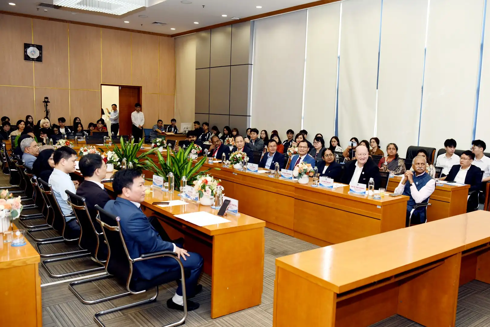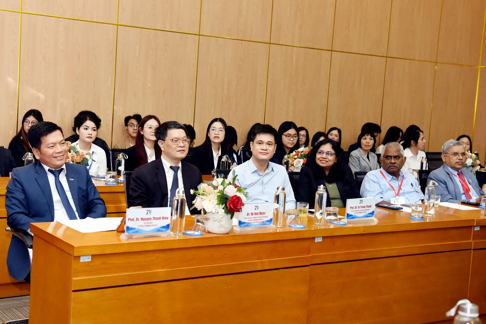 Về phía Đại học Kinh tế Quốc dân có: PGS.TS Bùi Huy Nhượng – Giám đốc Đại học; GS.TS Nguyễn Thành Hiếu – Phó Giám đốc Đại học; TS. Vũ Văn Ngọc – Viện trưởng Viện Đào tạo TT, CLC & POHE; GS.TS Trần Thọ Đạt – Chủ tịch Hội đồng Khoa học và Đào tạo; cùng đại diện lãnh đạo các Trường, Phòng ban, Khoa, Viện, Trung tâm, các đơn vị thuộc và trực thuộc, các cán bộ, giảng viên Đại học.