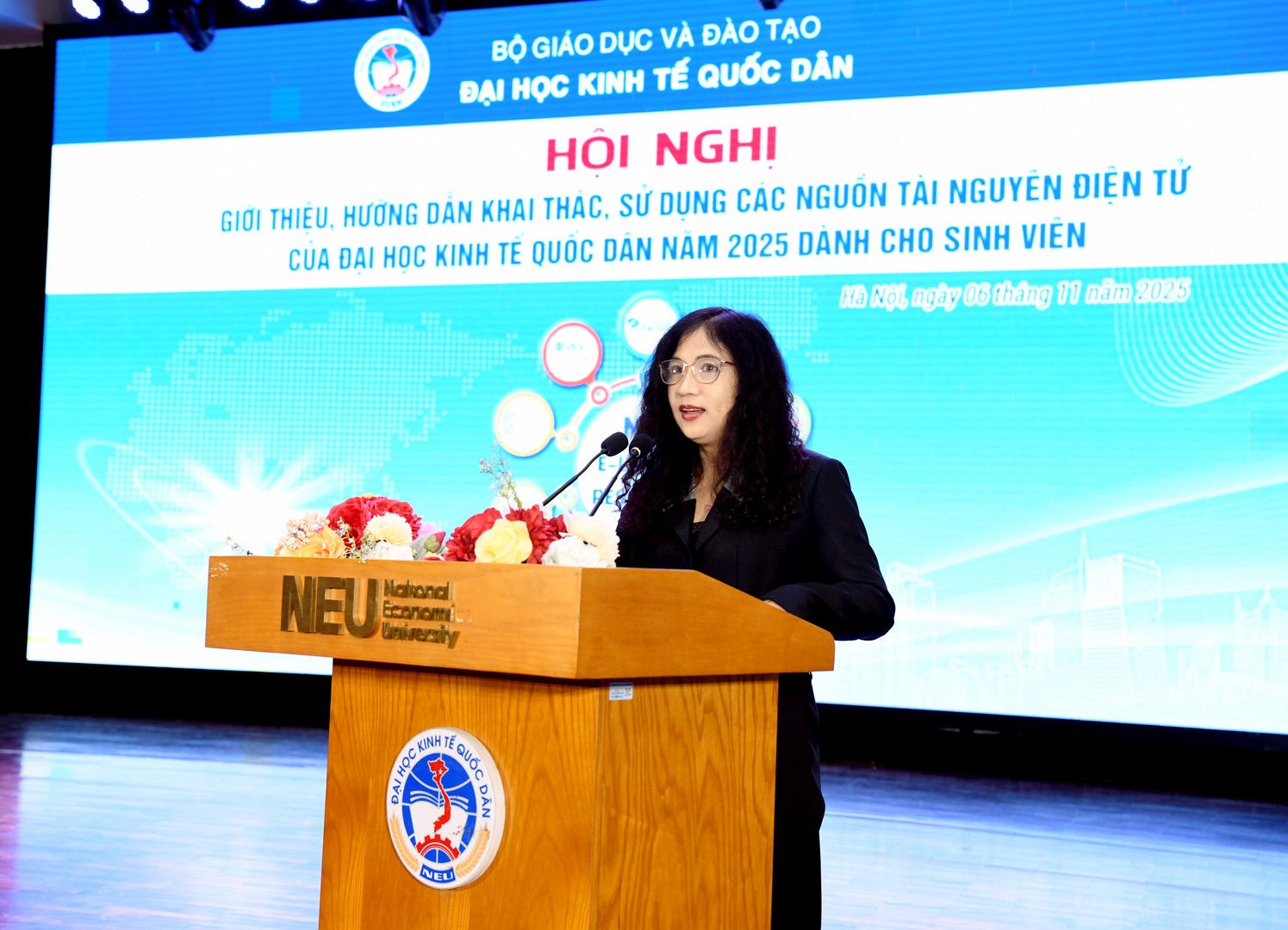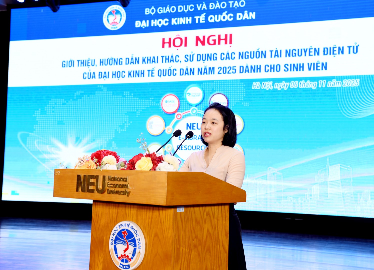Cũng tại Hội nghị, ThS. Bùi Thị Sen – Giám đốc Trung tâm Thông tin – Thư viện nhấn mạnh: “Trong bối cảnh chuyển đổi số trong giáo dục, kỹ năng khai thác và sử dụng tài nguyên điện tử không chỉ là công cụ hỗ trợ học tập, mà còn là năng lực nền tảng giúp sinh viên tiếp cận tri thức mới, phát triển tư duy phản biện và nâng cao hiệu quả nghiên cứu khoa học. Lãnh đạo Đại học Kinh tế Quốc dân luôn coi việc phát triển kỹ năng học tập suốt đời thông qua khai thác các nguồn thông tin học thuật theo chuẩn quốc tế là một trong những trọng tâm chiến lược, nhằm đào tạo thế hệ sinh viên NEU năng động, sáng tạo và hội nhập toàn cầu.”