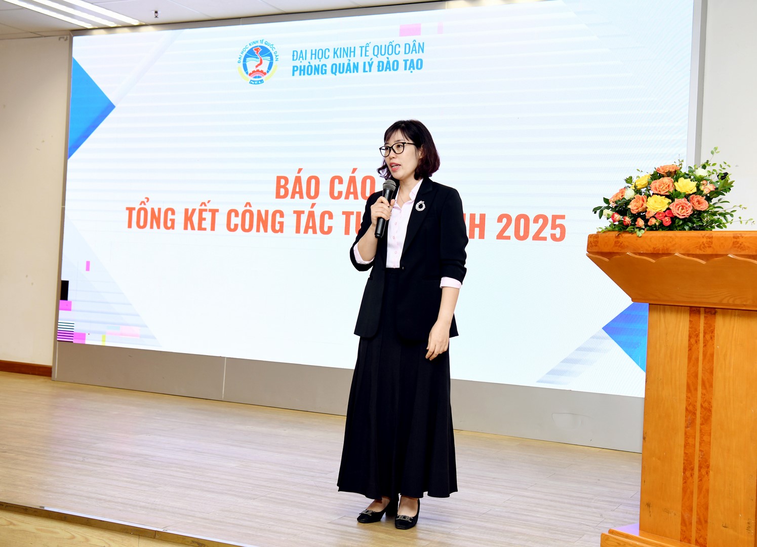 Trình bày báo cáo kết quả tuyển sinh đại học chính quy năm 2025, ThS. Hoàng Thanh Hà – Thành viên Ban Tuyển sinh, Phòng Quản lý Đào tạo cho biết, năm 2025, Đại học Kinh tế Quốc dân đã triển khai quy trình tuyển sinh chi tiết với 5 giai đoạn và 31 bước thực hiện, bao gồm xây dựng phương hướng, công bố đề án tuyển sinh, tổ chức tư vấn tuyển sinh, tiếp nhận và xử lý hồ sơ, chạy xét tuyển và xác nhận nhập học.