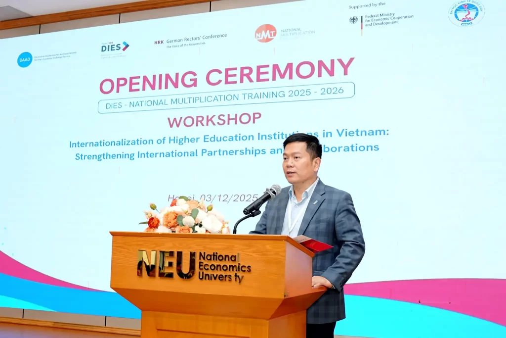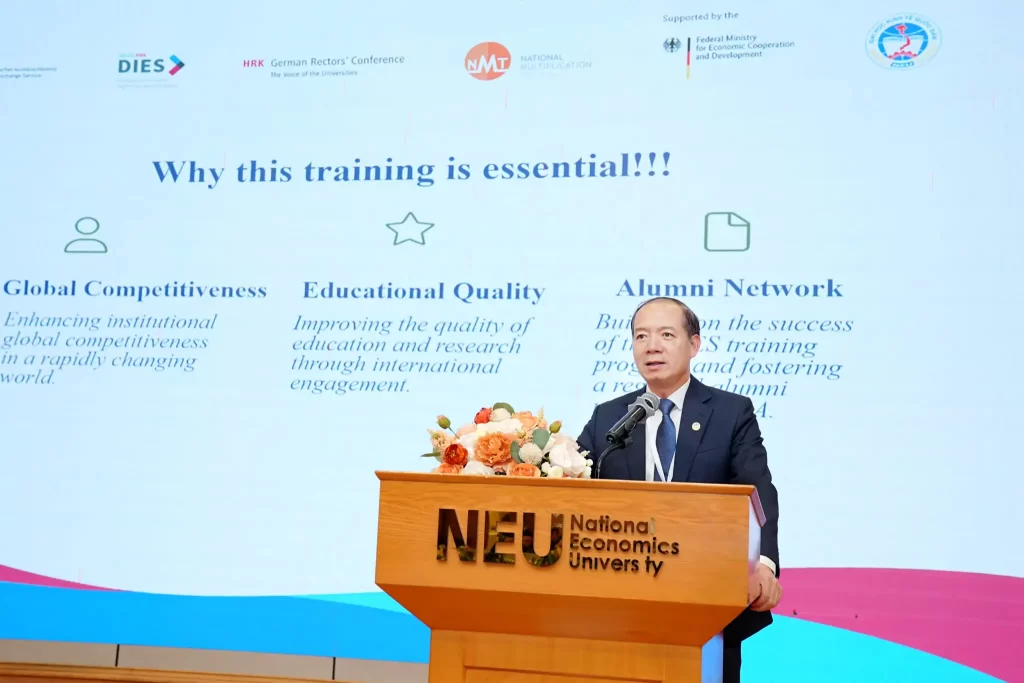 Phát biểu khai mạc, GS.TS Nguyễn Thành Hiếu – Phó Giám đốc Đại học Kinh tế Quốc dân gửi lời chào mừng đến các chuyên gia, khách mời quốc tế và toàn thể học viên tham dự khóa bồi dưỡng. GS.TS Nguyễn Thành Hiếu khẳng định, “quốc tế hóa không còn là lựa chọn, mà đã trở thành yêu cầu tất yếu đối với các cơ sở giáo dục đại học trong bối cảnh toàn cầu hóa sâu rộng”. Đồng thời, Giáo sư, Phó Giám đốc Đại học cũng nhấn mạnh vai trò then chốt của chương trình trong việc trang bị kiến thức, kỹ năng, tư duy chiến lược và cách tiếp cận hiện đại cho đội ngũ cán bộ phụ trách công tác hợp tác quốc tế tại các trường đại học.
