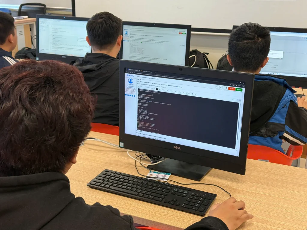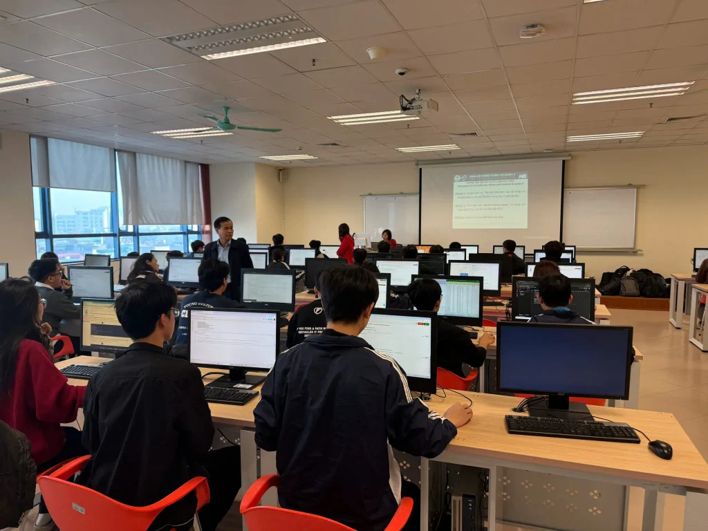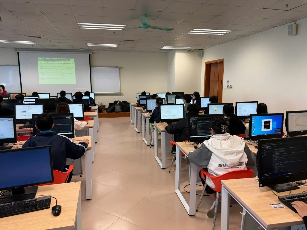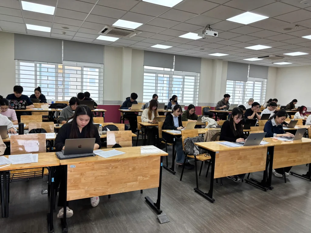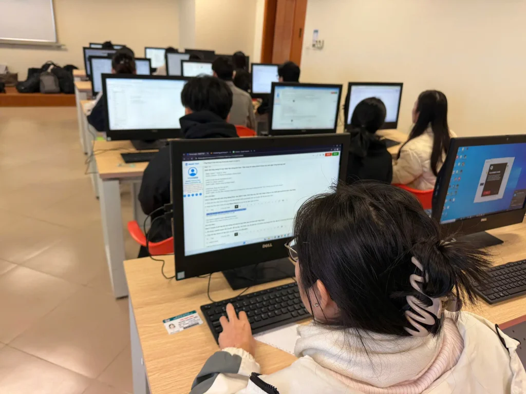 Trong buổi thi sáng 24/11, hai học phần thuộc Trường Công nghệ được đưa vào triển khai, gồm học phần “Ứng dụng trí tuệ nhân tạo trong kinh doanh và quản lý” với 88 sinh viên tham gia và học phần “Lập trình hướng đối tượng” với 193 sinh viên tham gia. Từ 7 giờ sáng, tổng cộng 281 sinh viên đã có mặt tại giảng đường để thực hiện các thủ tục check-in, ổn định chỗ ngồi và kiểm tra máy tính trước khi bước vào làm bài.