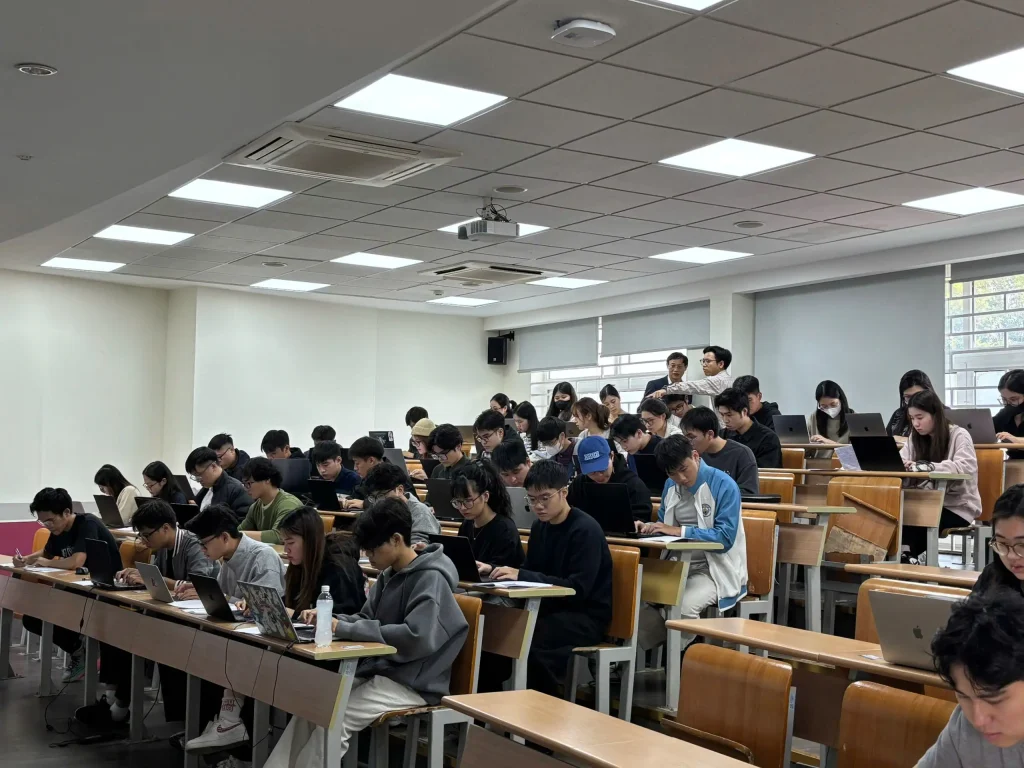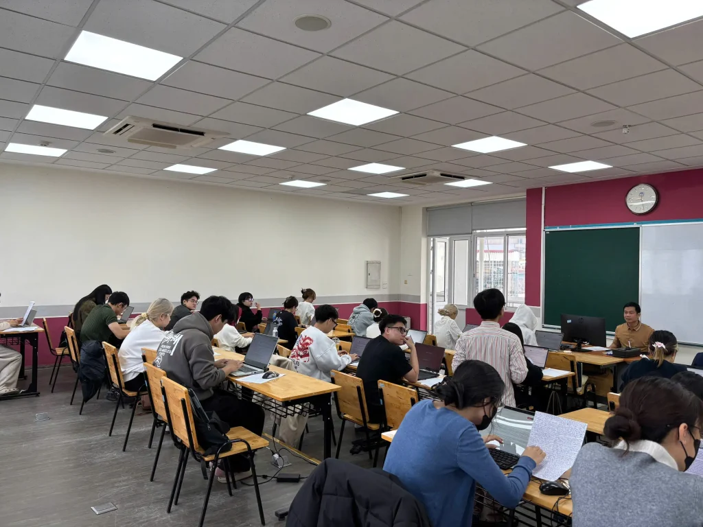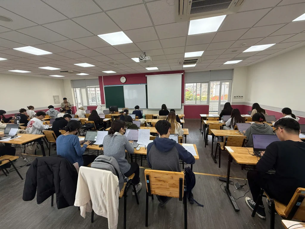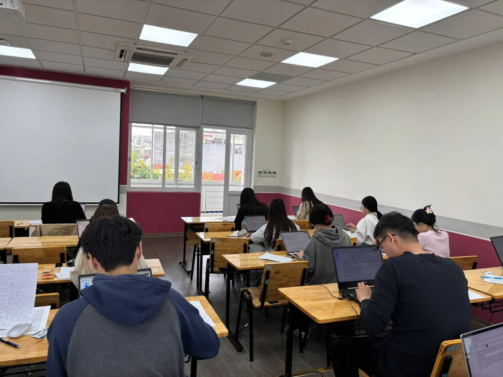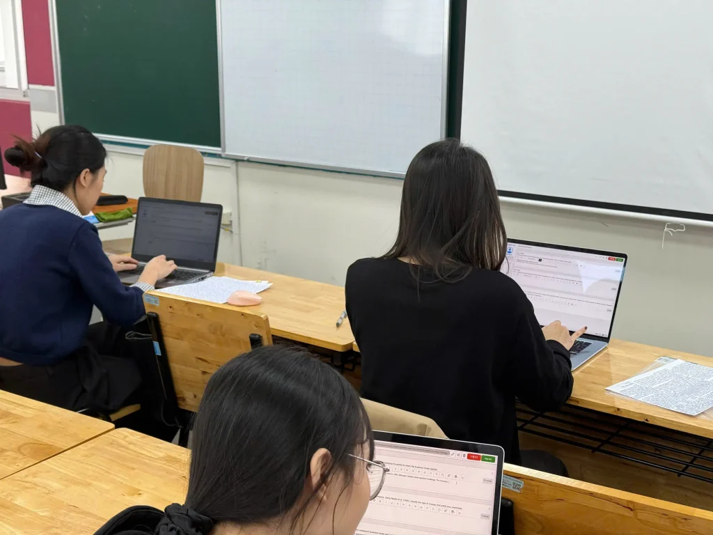 Trong buổi thi sáng 24/11, hai học phần thuộc Trường Công nghệ được đưa vào triển khai, gồm học phần “Ứng dụng trí tuệ nhân tạo trong kinh doanh và quản lý” với 88 sinh viên tham gia và học phần “Lập trình hướng đối tượng” với 193 sinh viên tham gia. Từ 7 giờ sáng, tổng cộng 281 sinh viên đã có mặt tại giảng đường để thực hiện các thủ tục check-in, ổn định chỗ ngồi và kiểm tra máy tính trước khi bước vào làm bài.