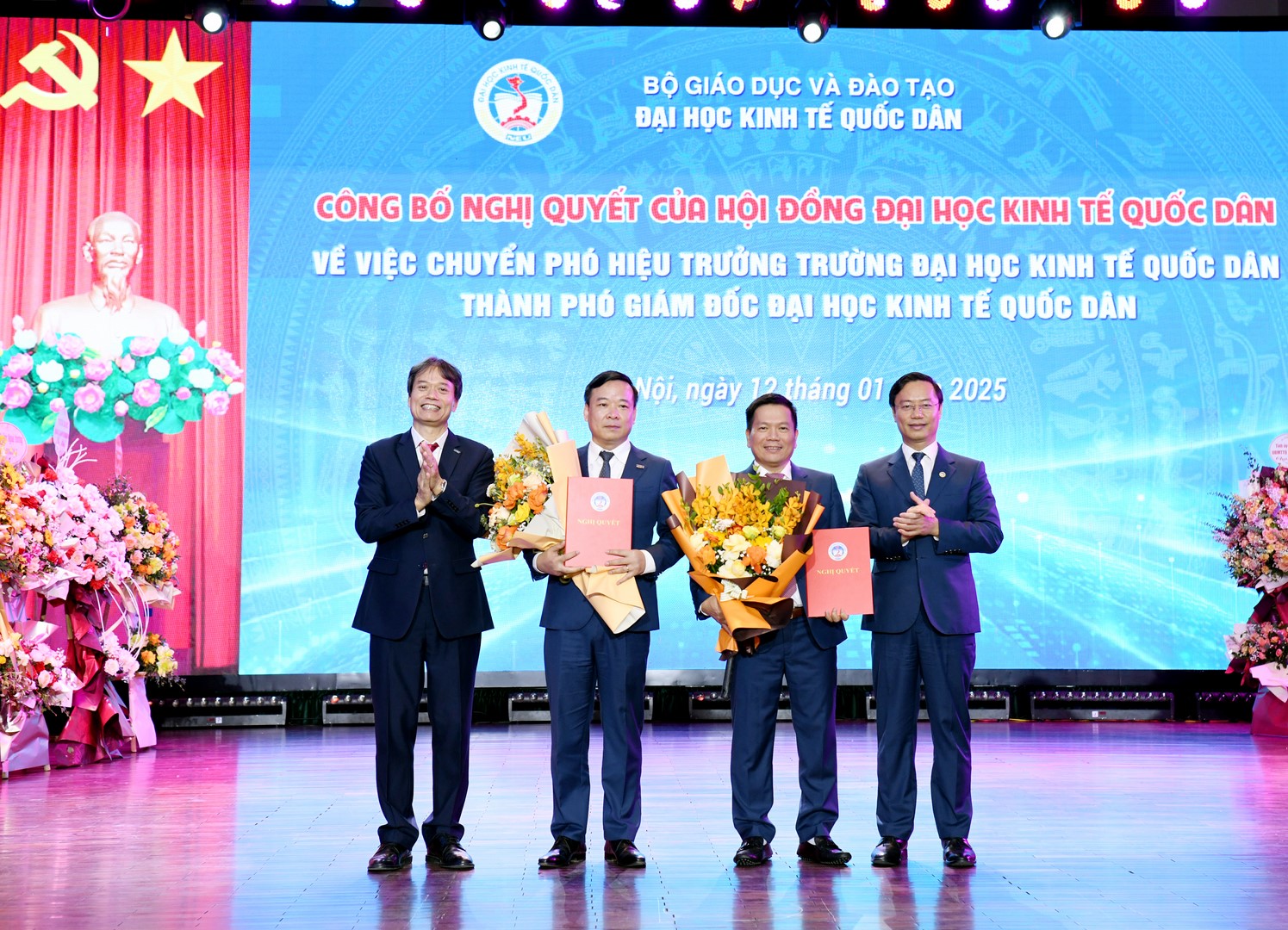 PGS.TS Bùi Đức Thọ – Chủ tịch Hội đồng Đại học trao Nghị Quyết của Hội đồng Đại học và GS.TS Phạm Hồng Chương -Giám đốc Đại học tặng hoa chúc mừng PGS.TS Bùi Huy Nhượng và GS.TS Nguyễn Thành Hiếu – Phó Giám đốc Đại học Kinh tế Quốc dân