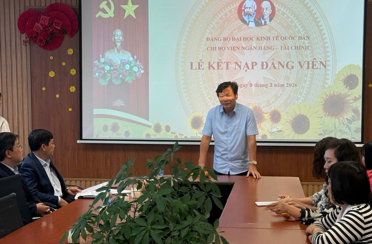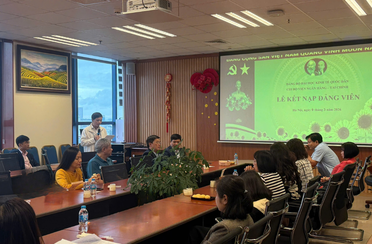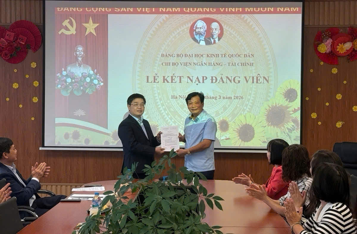Ngày 09/03/2026, tại văn phòng Viện Ngân hàng – Tài chính, Chi bộ Viện Ngân hàng – Tài chính đã trang trọng tổ chức Lễ kết nạp Đảng viên mới cho quần chúng ưu tú TS. Đặng Ngọc Biên – Giảng viên Bộ môn Lý thuyết Tài chính – Tiền tệ. Buổi lễ diễn ra trong không khí trang nghiêm, thể hiện sự quan tâm của Chi bộ Viện Ngân hàng – Tài chính đối với công tác phát triển Đảng trong đội ngũ cán bộ, giảng viên của Viện.