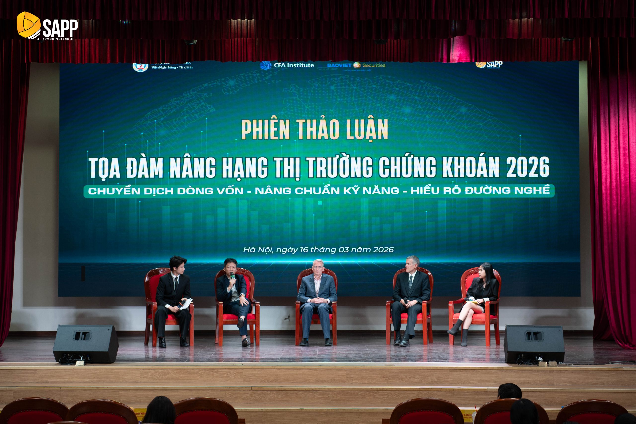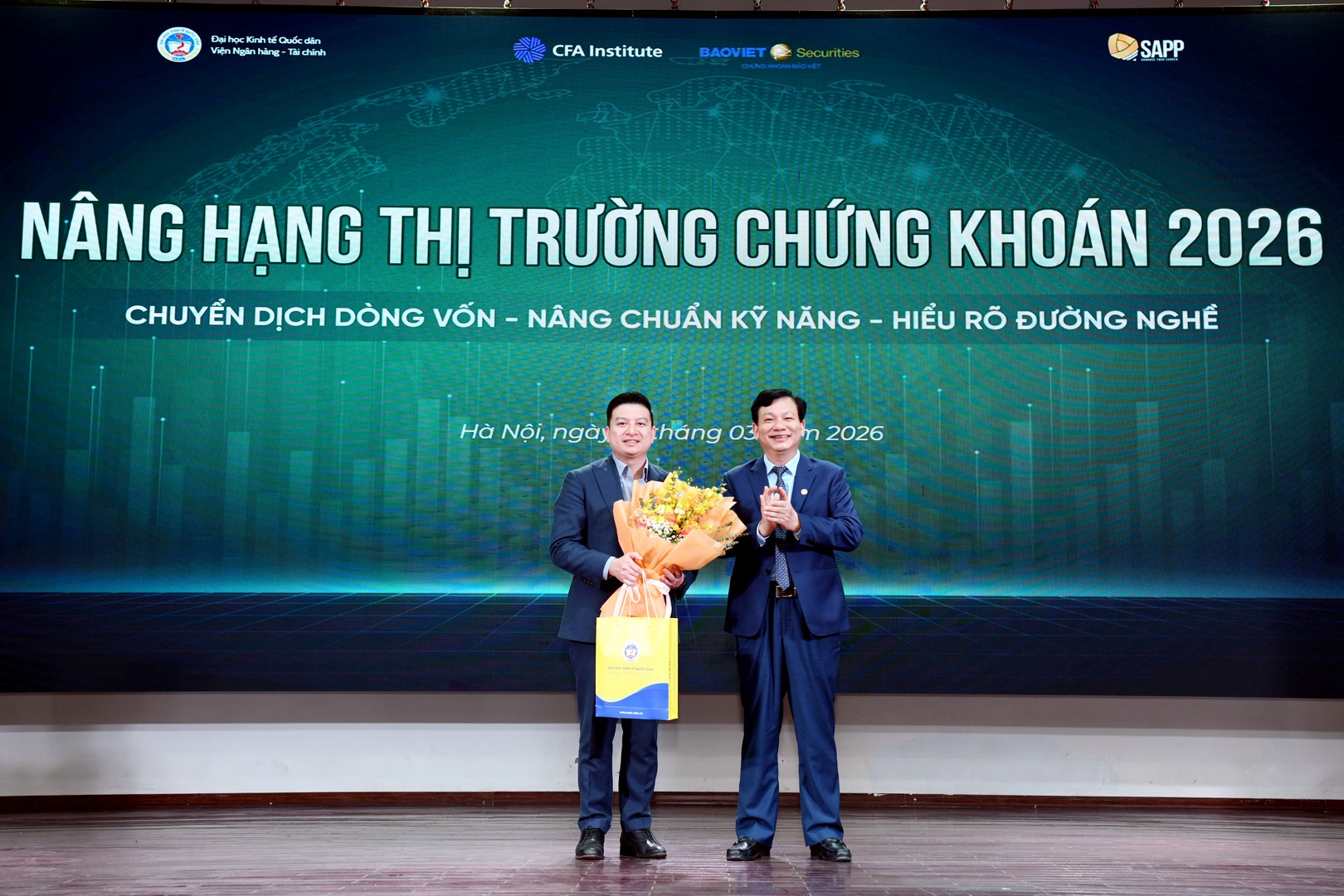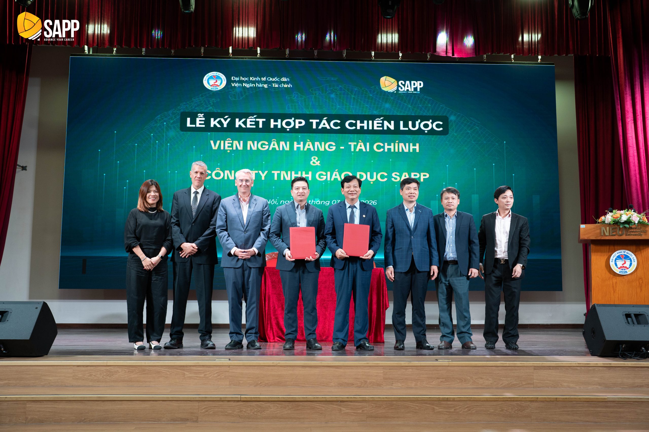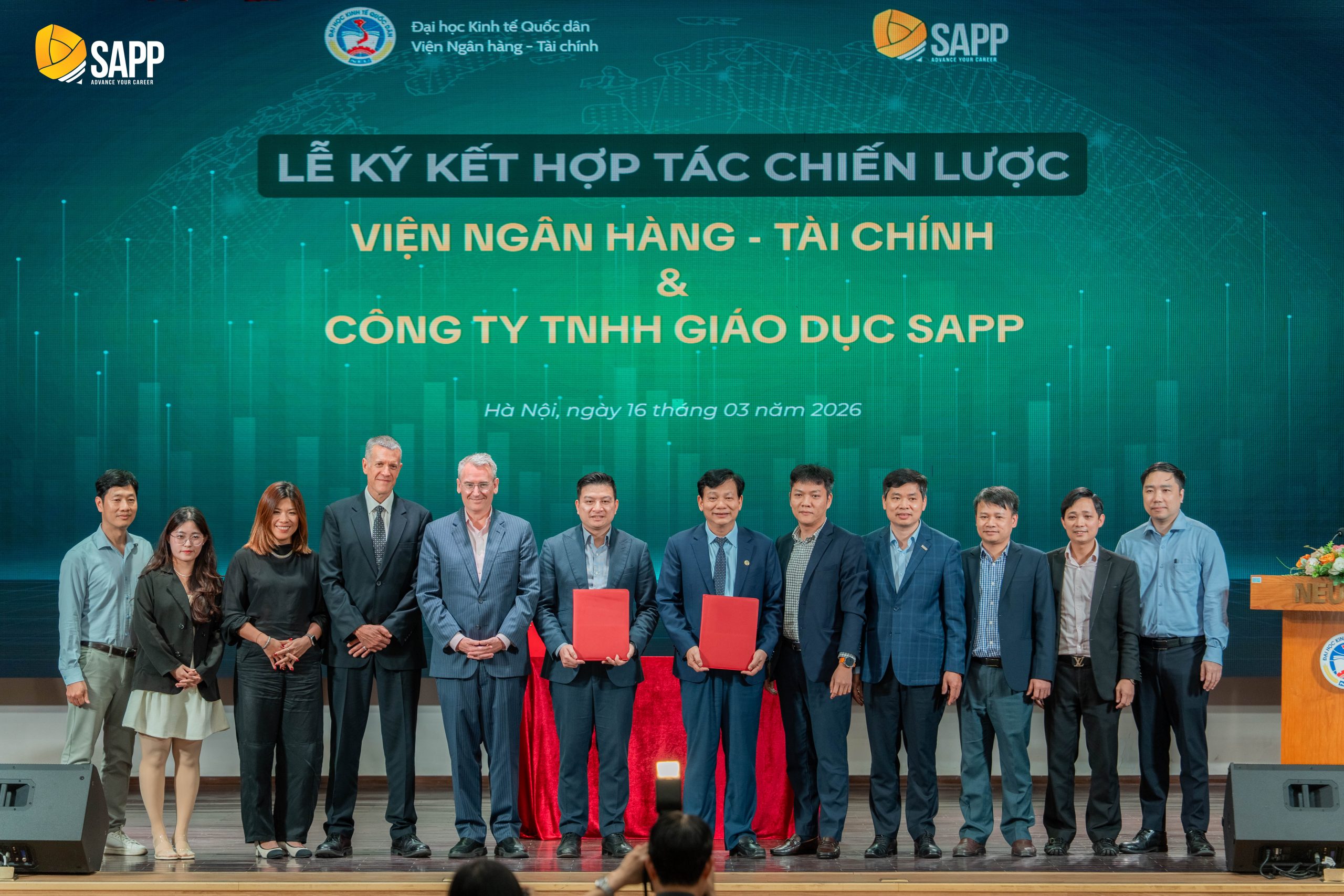 Chiều ngày 16/03/2026, tại Đại học Kinh tế Quốc dân, Viện Ngân hàng – Tài chính đã phối hợp với Công ty Cổ phần Giáo dục SAPP tổ chức Lễ ký kết Thỏa thuận hợp tác chiến lược trong khuôn khổ Tọa đàm chuyên đề “Nâng hạng Thị trường Chứng khoán 2026: Chuyển dịch dòng vốn – Nâng chuẩn kỹ năng – Hiểu rõ đường nghề”. Sự kiện đánh dấu bước đi quan trọng trong việc gắn kết giữa đào tạo học thuật và chuẩn mực nghề nghiệp quốc tế, đáp ứng yêu cầu hội nhập của thị trường tài chính Việt Nam.