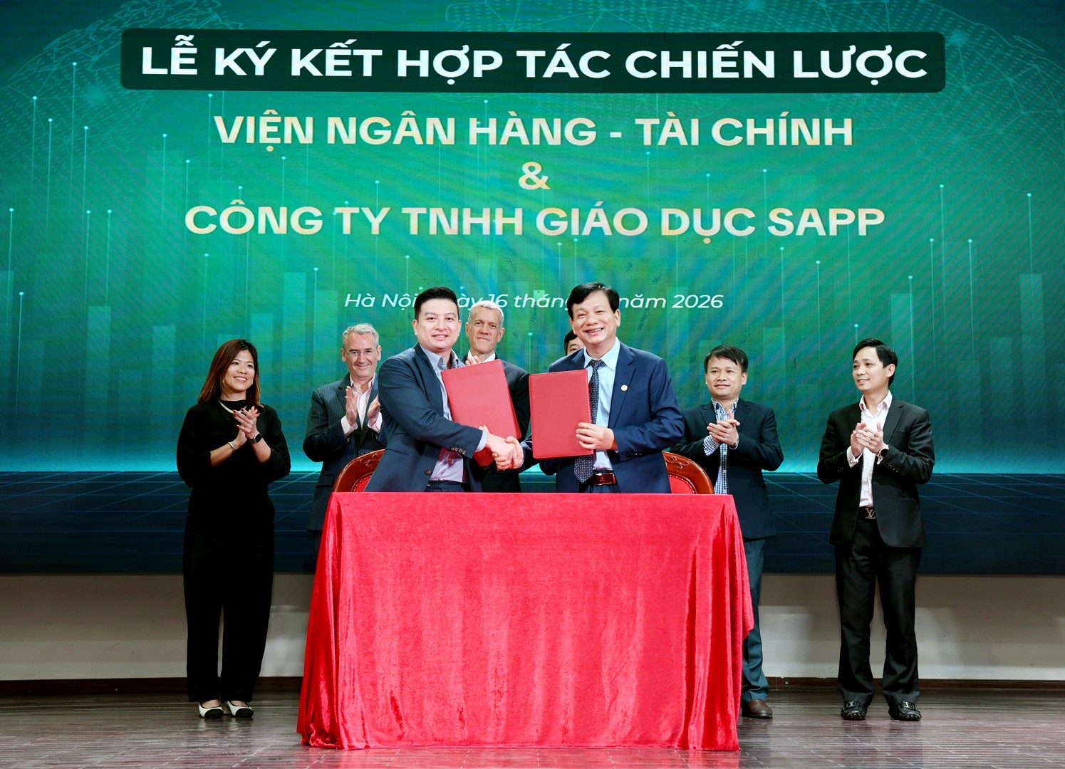 Ảnh: Đại diện Viện Ngân hàng – Tài chính và SAPP Academy trao văn bản ký kết và bắt tay đánh dấu hợp tác chiến lược.