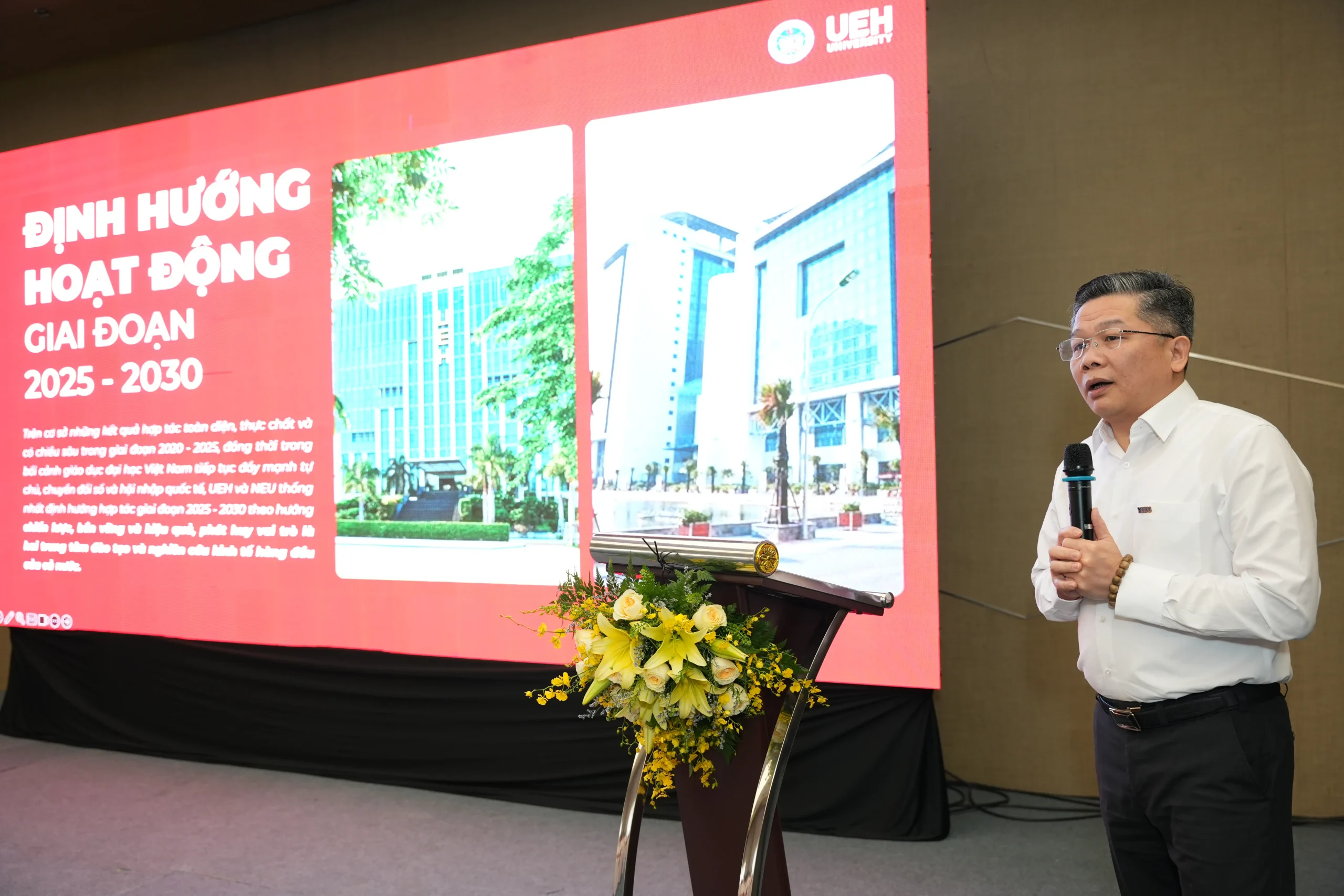 Phó Giám đốc phụ trách UEH bày tỏ kỳ vọng Tọa đàm sẽ là dịp để hai trường tiếp tục trao đổi kinh nghiệm, tăng cường phối hợp và triển khai các hoạt động hướng tới kỷ niệm 50 năm thành lập UEH và 70 năm thành lập NEU. Đồng thời, chúc mối quan hệ hợp tác giữa hai đại học ngày càng bền chặt, ý nghĩa và hiệu quả hơn.