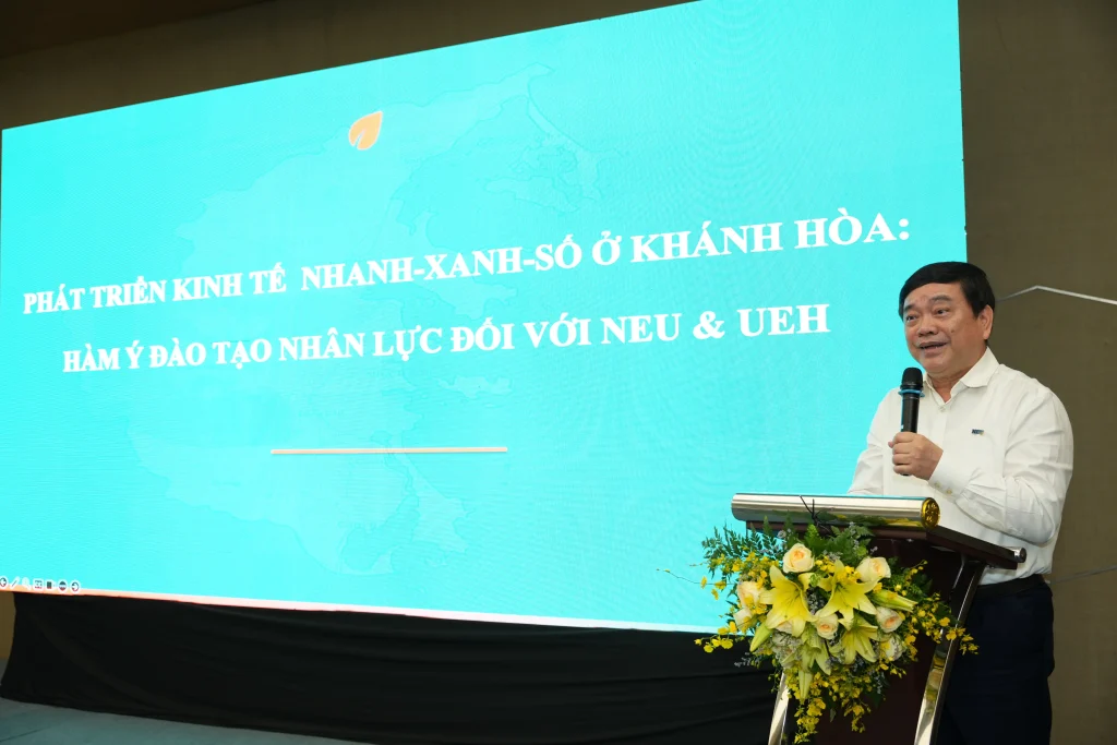 Đáng chú ý, GS.TS Trần Thọ Đạt – Chủ tịch Hội đồng Khoa học và Đào tạo Đại học Kinh tế Quốc dân, nguyên Bí thư Đảng ủy, nguyên Hiệu trưởng đã trình bày chuyên đề “Phát triển kinh tế nhanh – xanh – số ở Khánh Hoà: Hàm ý đào tạo nhân lực đối với NEU và UEH”, nhấn mạnh vai trò của liên kết đại học trong đáp ứng nhu cầu phát triển kinh tế – xã hội địa phương.