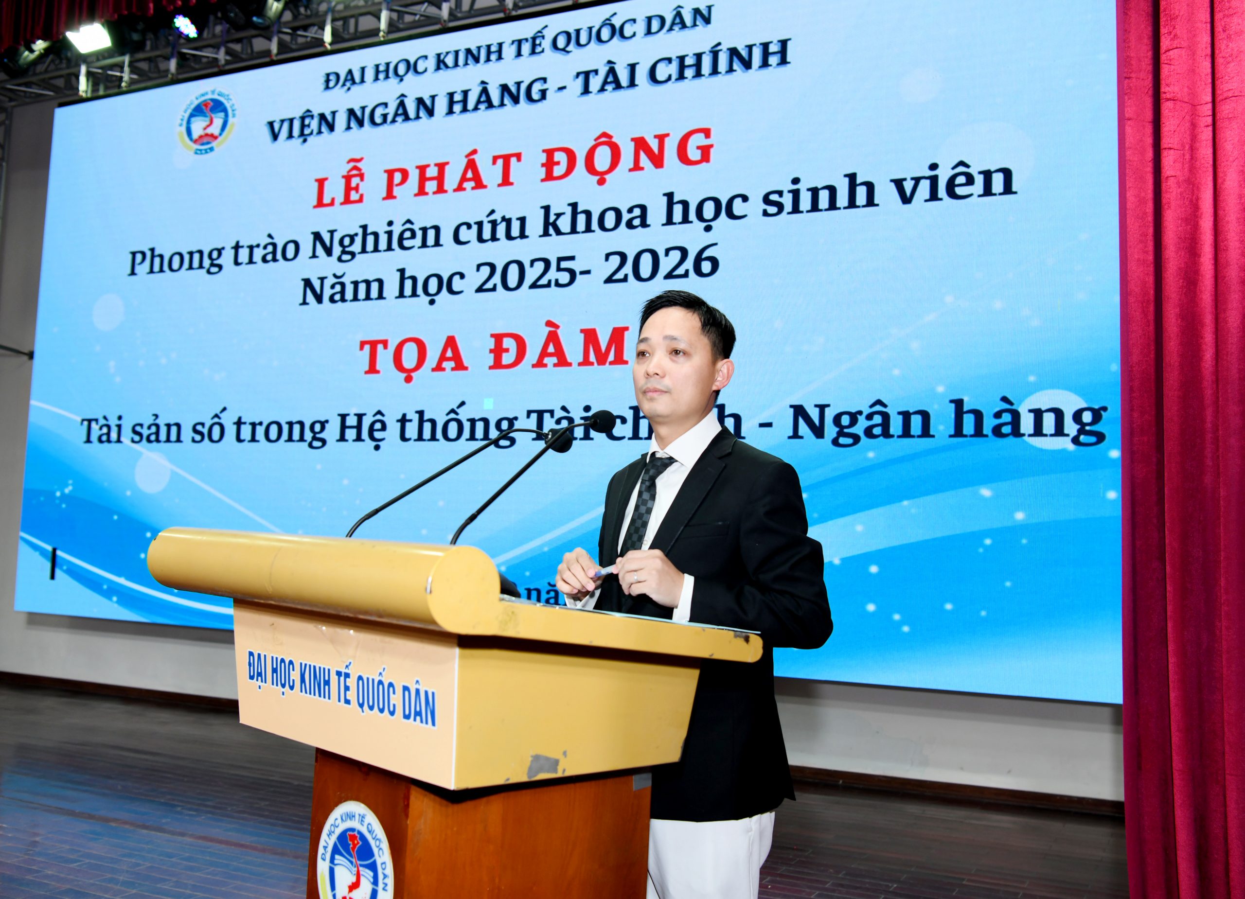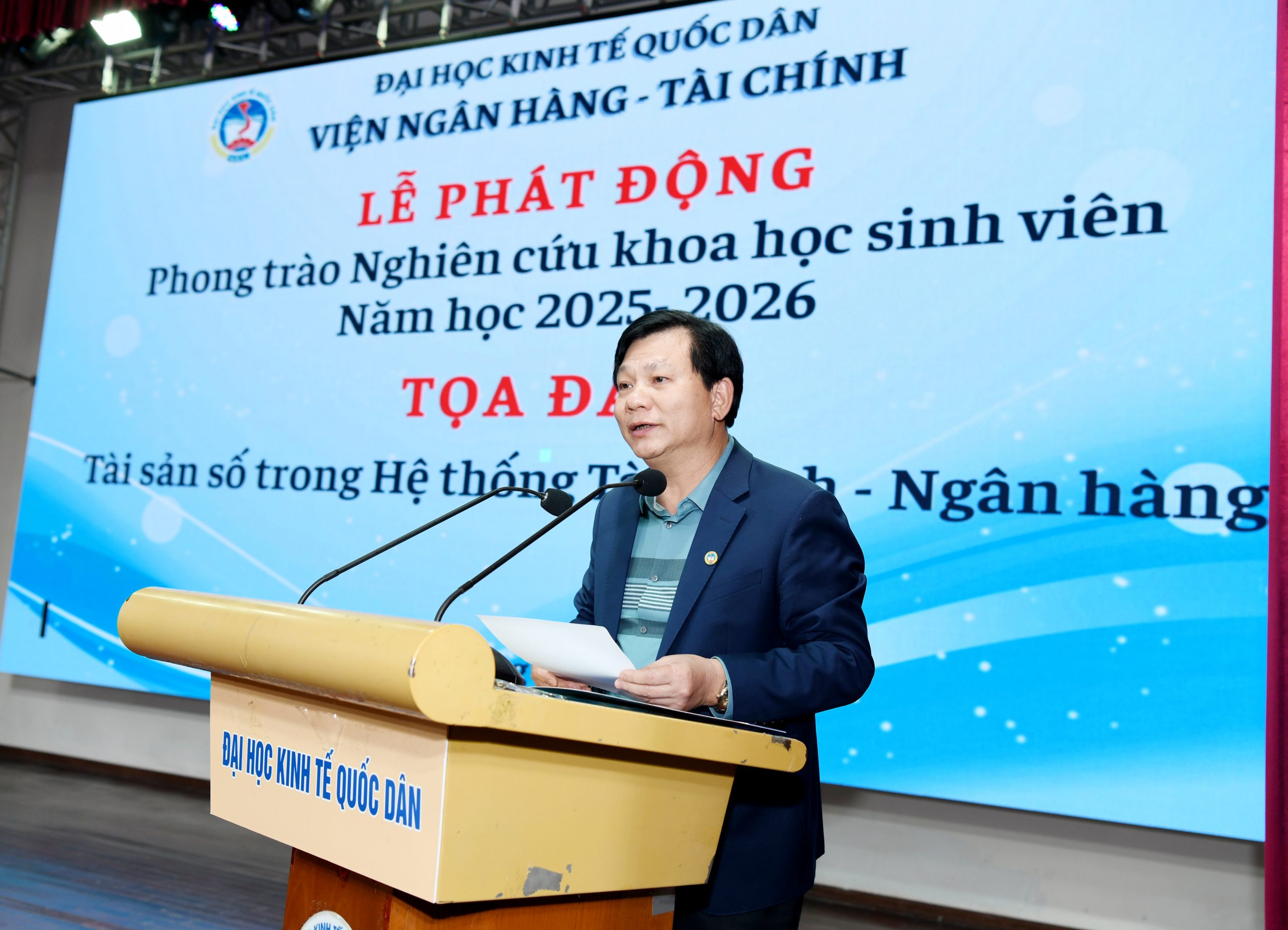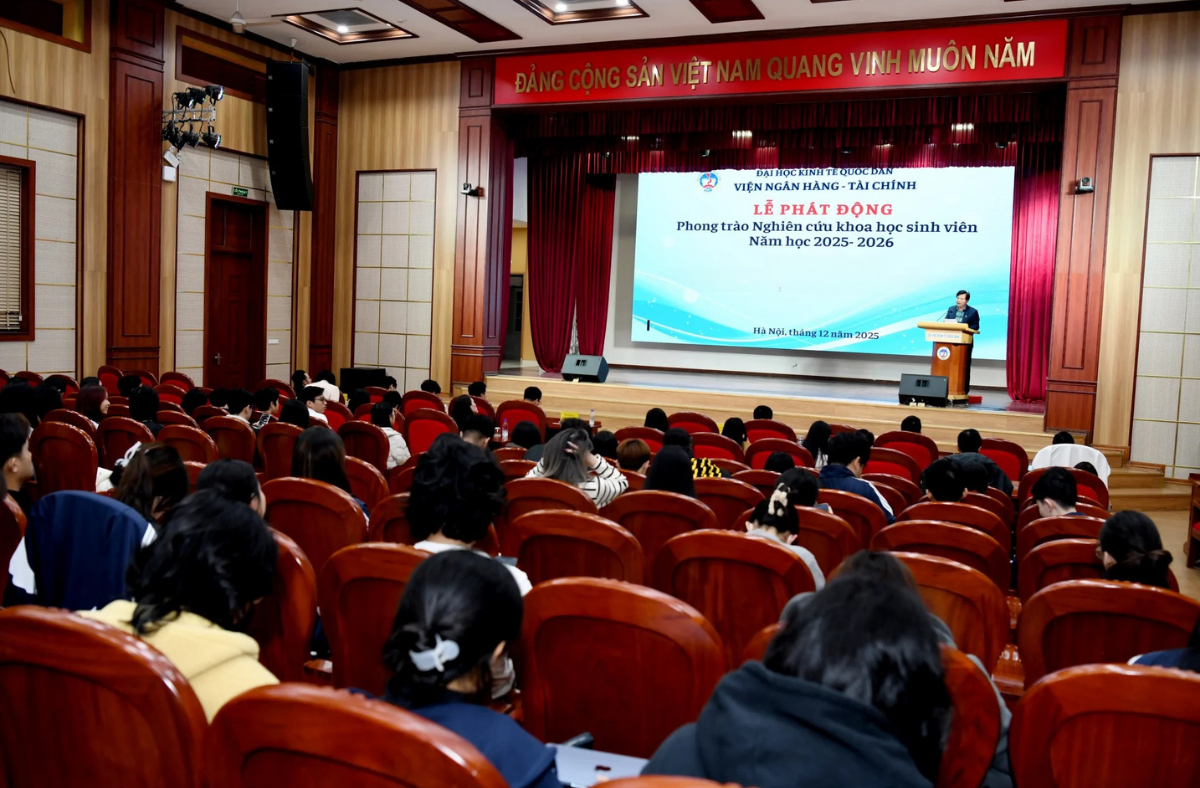 Chiều ngày 29/12/2025, tại Nhà Văn hoá – Đại học Kinh tế Quốc dân, Viện Ngân hàng – Tài chính, Đại học Kinh tế Quốc dân đã tổ chức Hội nghị “Tổng kết hoạt động nghiên cứu khoa học sinh viên năm 2025” và Phát động “Phong trào nghiên cứu khoa học sinh viên năm 2026”. Hội nghị được tổ chức nhằm đánh giá kết quả thực hiện công tác nghiên cứu khoa học sinh viên (NCKHSV) trong năm học 2024-2025, đồng thời xác định phương hướng, nhiệm vụ trọng tâm trong thời gian tới.